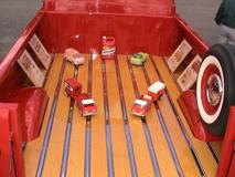 The truck was garaged all the time, and in 1993 I met Mark and Pete Robuffo, members of Terry’s Car Club, and saw some of the outstanding restoration and bodywork they did. I was lucky enough to have them do the bodywork. I located an NOS nose, wheels, trim, glass, weather stripping, bumpers, tailgate, lenses, and emblems…whatever I could get. Jimmy at Phoenix Auto Upholstery in Franklin Square did the interior of the truck. Bruce Horkey Cabinetry in Minnesota, who I met one year at Spring Carlisle, created the pickup bed. He had patterns at that time for about 60 pickup trucks, but not for an Econoline. He thought he knew of one in another town and traveled about 40 miles to make a pattern. The bed is made of kiln dried ash, with seven coats of marine urethane. The ribs and hardware are stainless steel. The bed is totally removable.